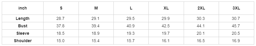 - Sizes: S, M, L, XL, 2XL, 3XL (See size chart)